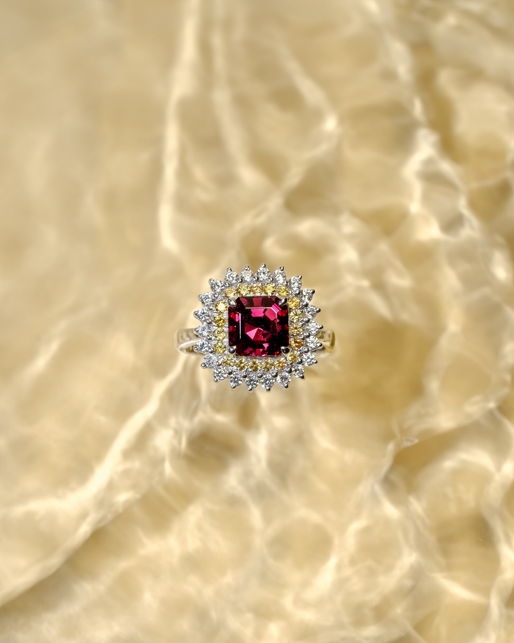 Rhodolite Garnet with yellow Sapphires and white Cubic Zirconia.